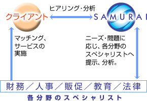 SAMURAI Management consultantでは、クライアント様のお悩み・ニーズに際して、入念なヒアリング・打ち合わせの元、独自分析を行い、その診断結果に応じて提携する各分野のスペシャリストをマッチングし、サービスを行います。